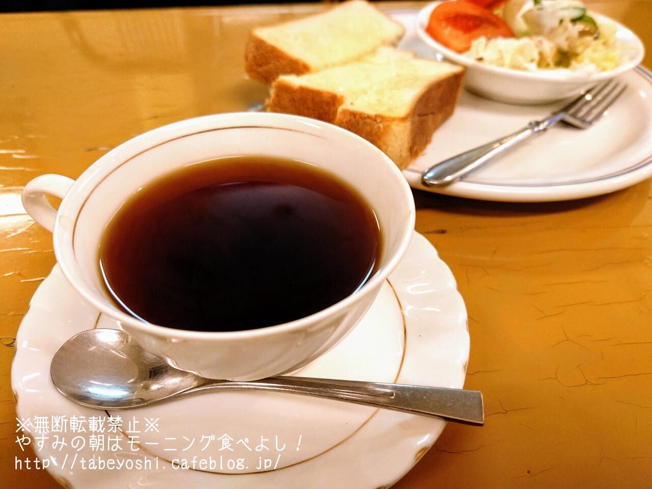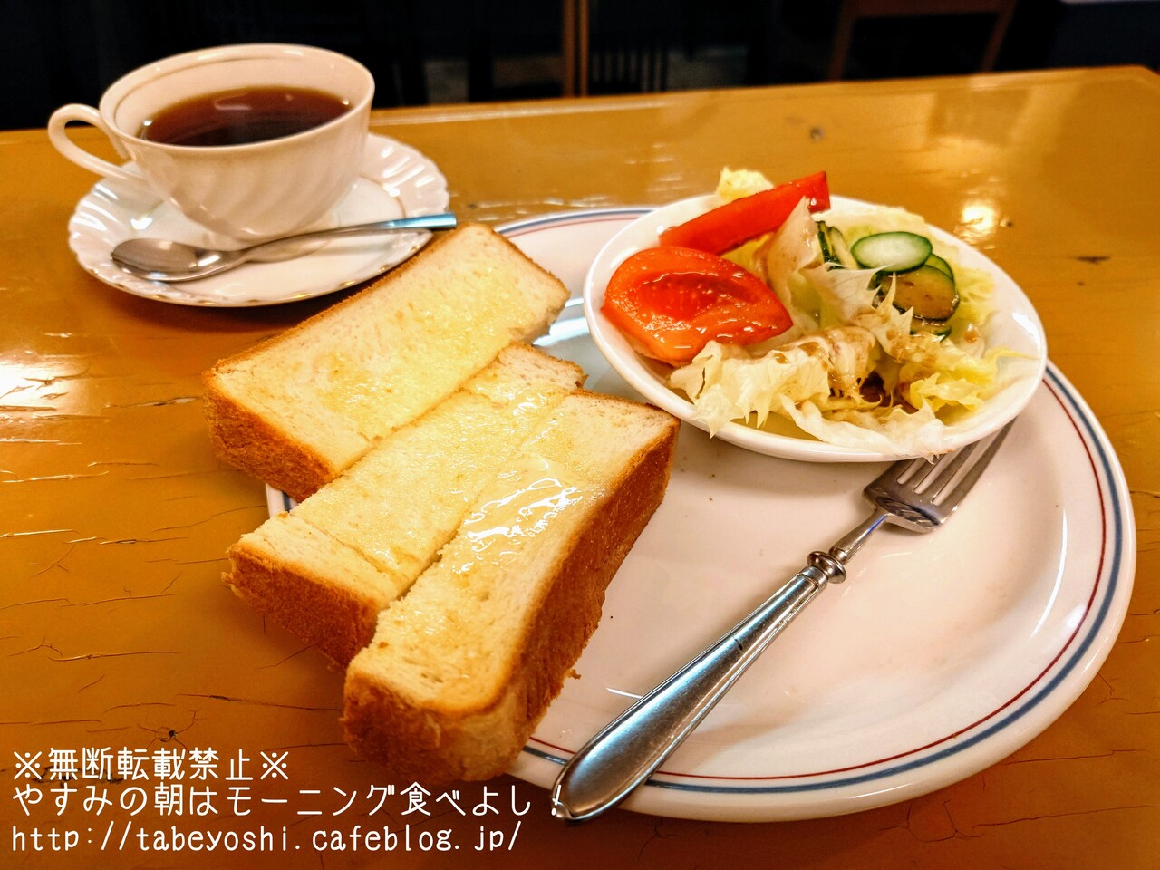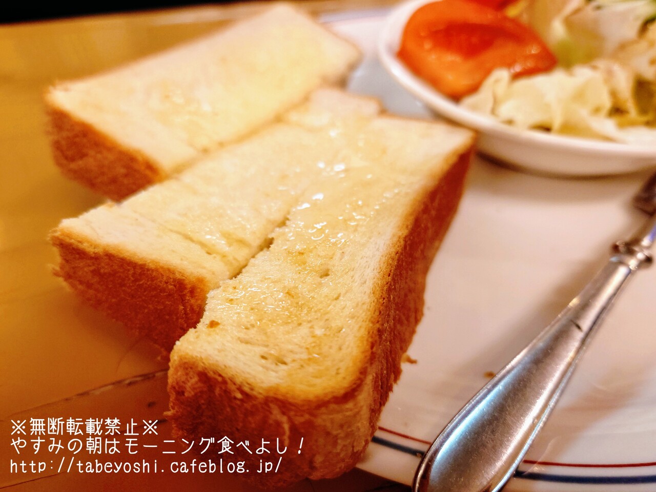 厚切りトーストはあっさり目の焼き加減がバターを程よく染み込ませてる。